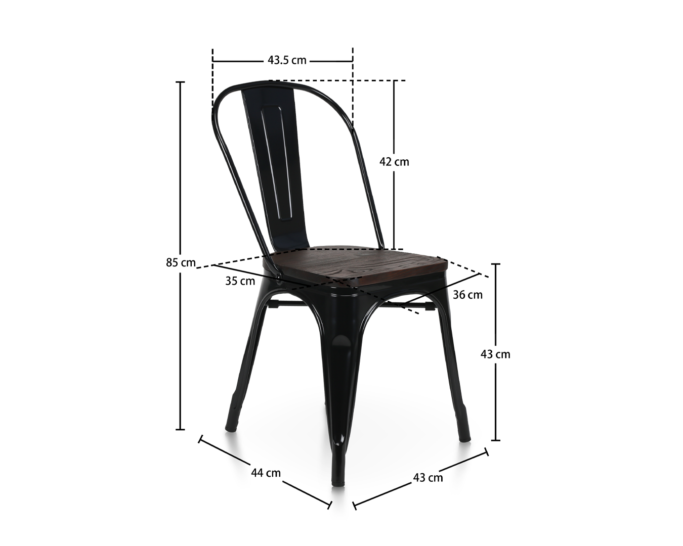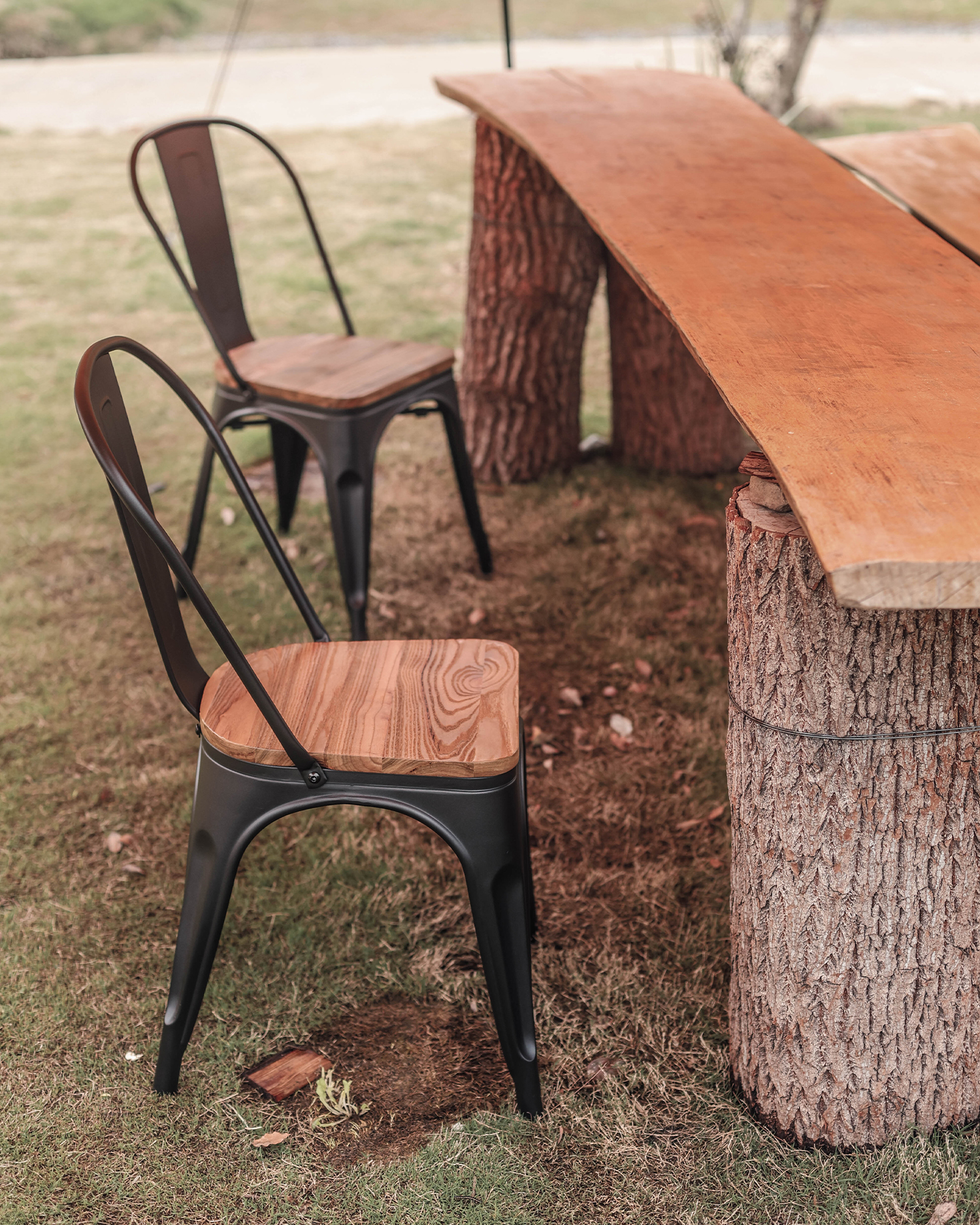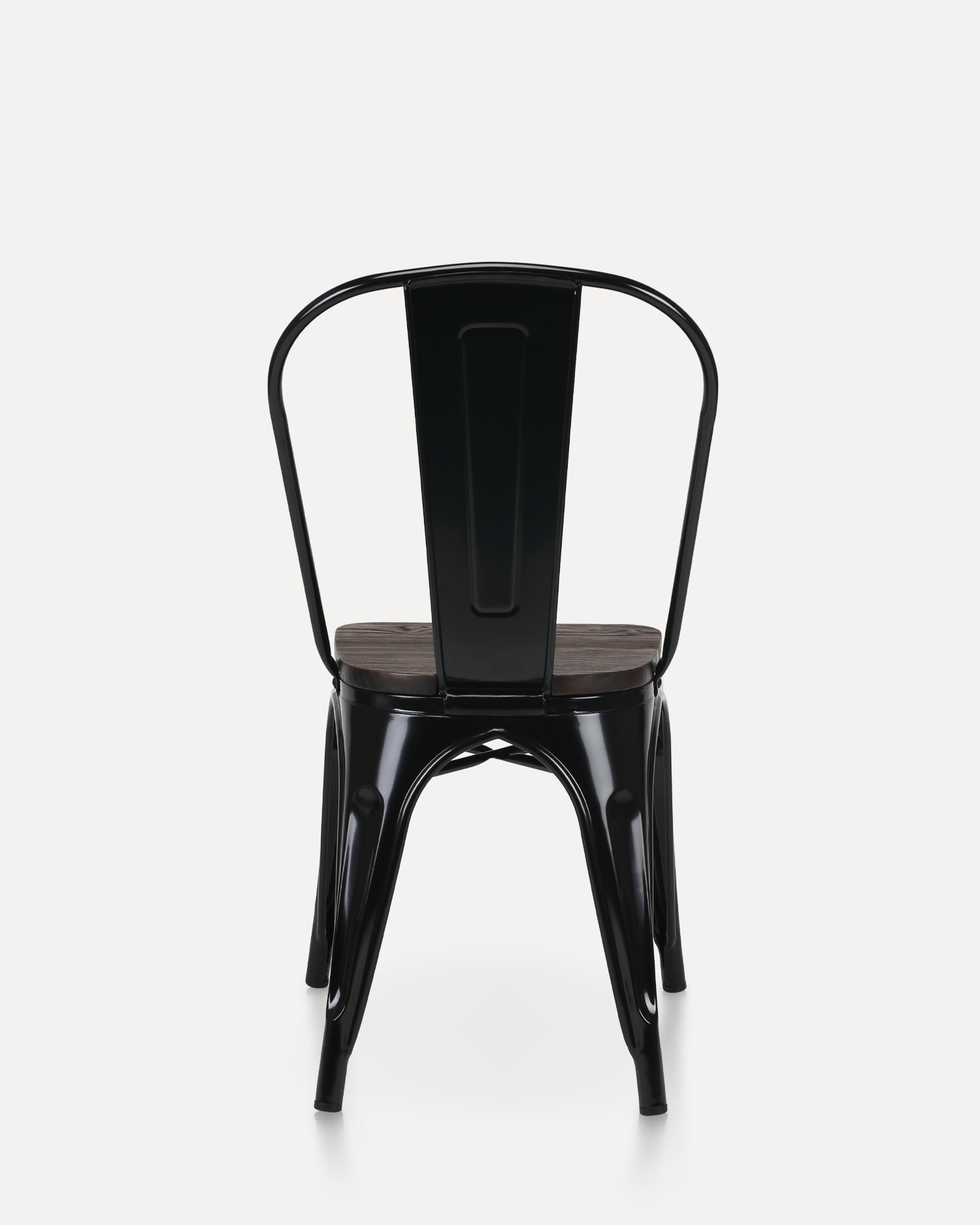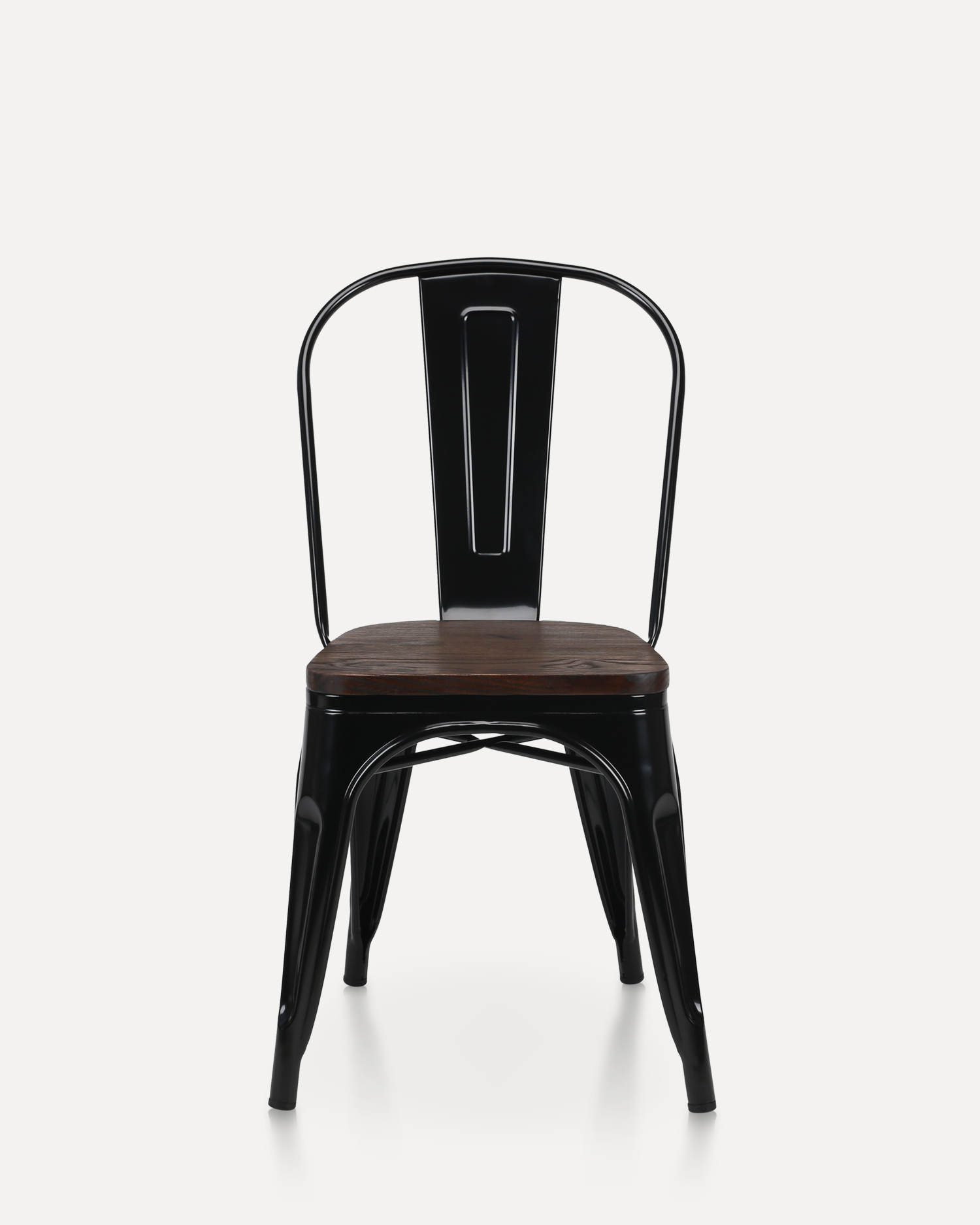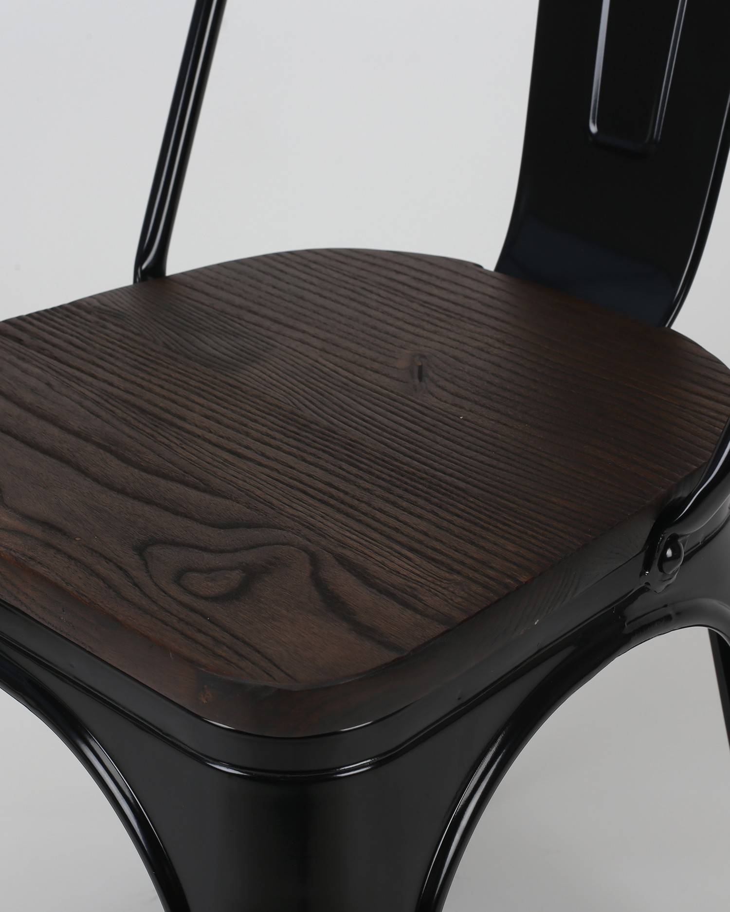 • Denne stol er et vidnesbyrd om den vedvarende appel af industriel æstetik med en slank sort jernramme, der udstråler styrke og raffinement. Tilsætningen af ​​et træsæde introducerer et varmt, indbydende element, der blødgør formandens industrielle look, hvilket skaber en harmonisk balance mellem form og funktion.