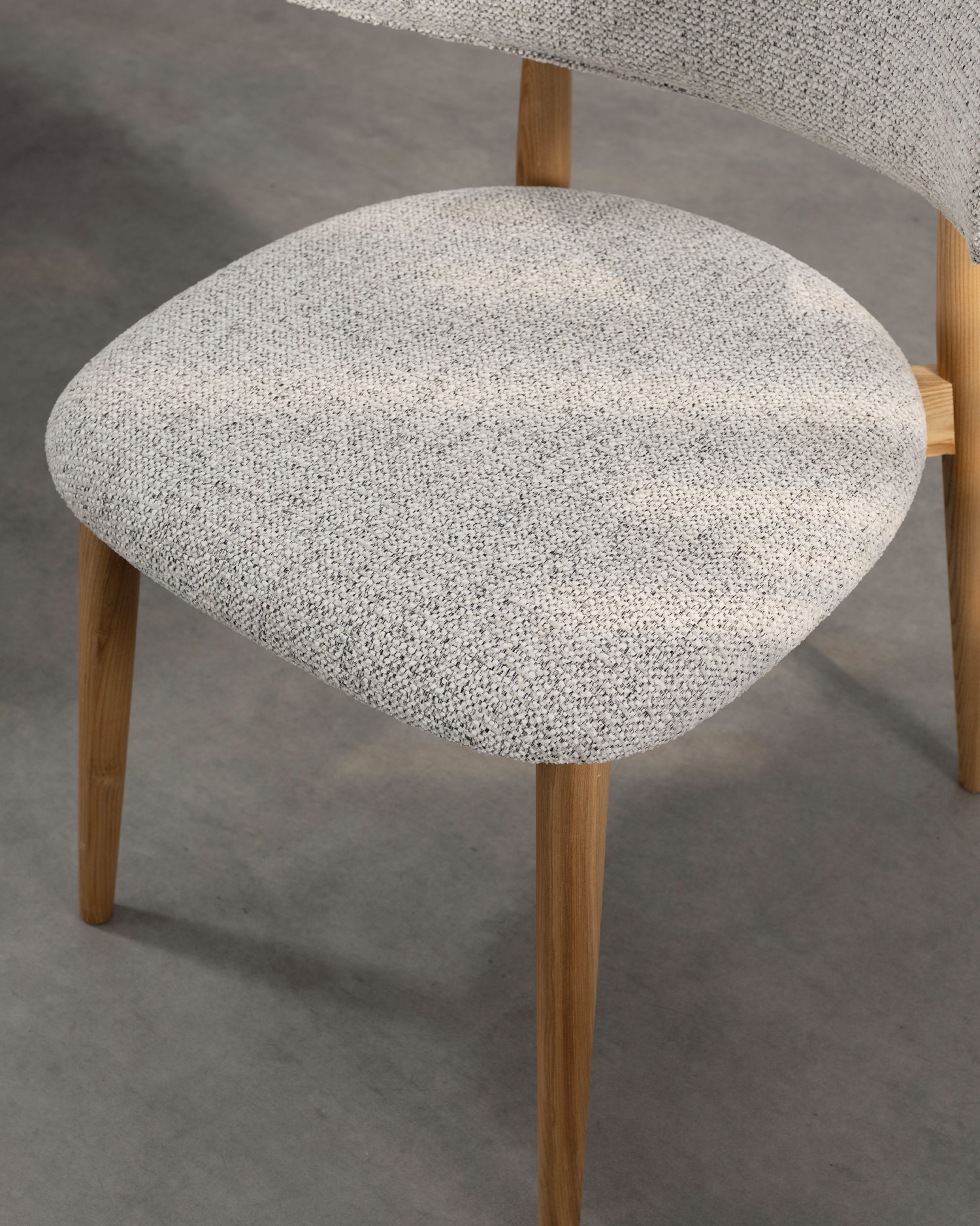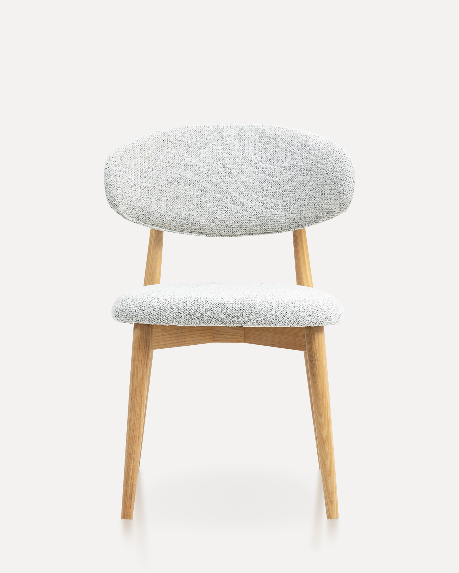 • Udformet af naturligt Ashwood har hver stol unikke kornmønstre og farvevariationer, hvilket tilføjer sin karakter og charme, på samme tid det polstrede sæde med blødt stof og svamp tilbyder en behagelig siddepladsoplevelse.